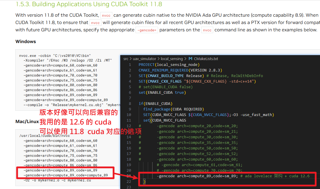 然后看自己能够支持的 nvcc 编译器的选项,然后在项目的 src/uav_simulator/local_sensing/CMakeLists.txt 中修改 CUDA_NVCC_FLAGS